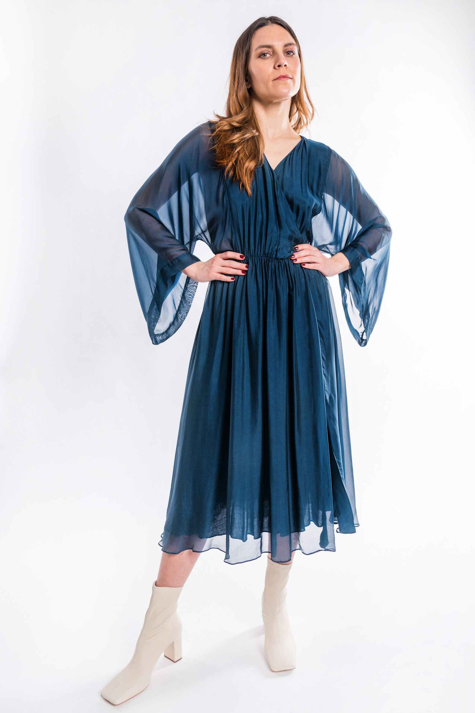 Dieses Cocktail/Abend Kleid ist ein ideales Outfit für jegliche Abendanlässe. Es hat Kimonoärmel und die Taille ist mit einem Gummiband versehen und schmiegt sich ideal an den Körper an.