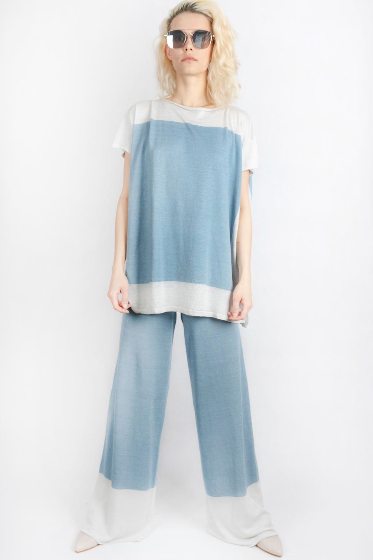 Eine elastische Mischung des lockeren Leinenanzug in sportlichem Look. Hochsitzende Hose mit weitem Bein und ein lockeres Schnitt des Oberteils.