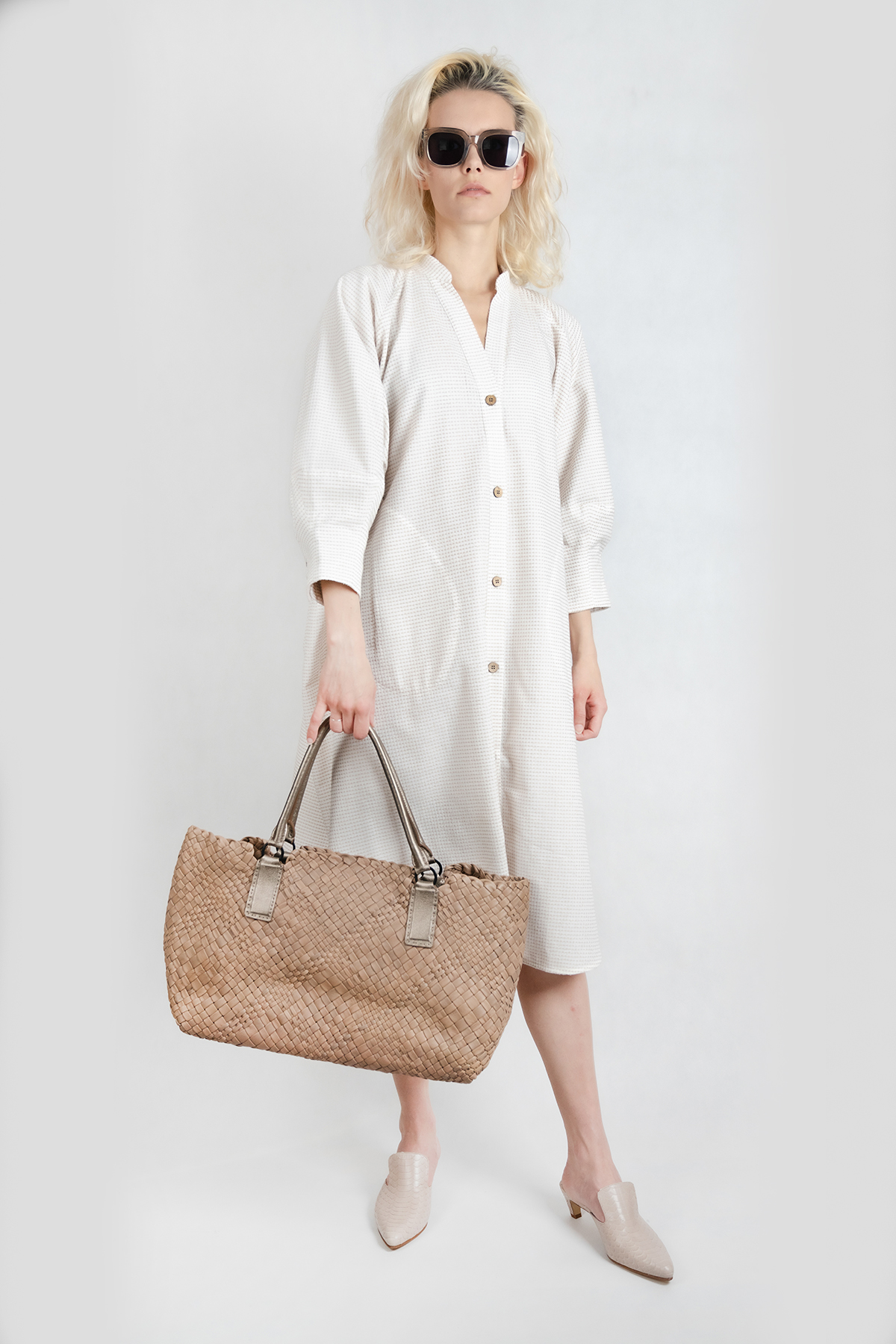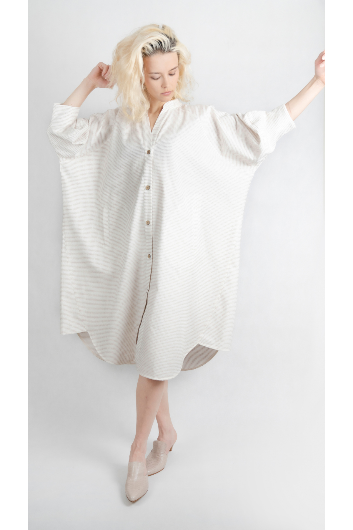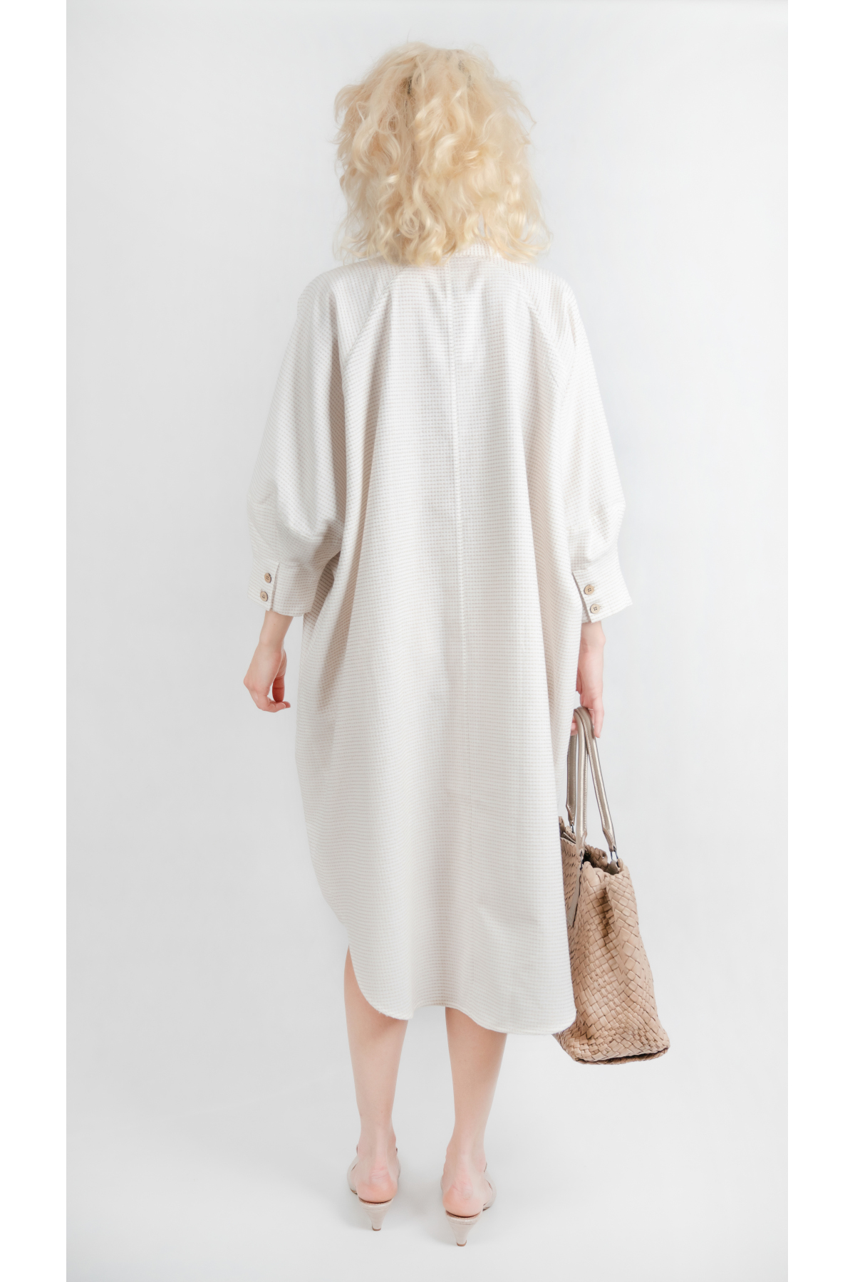 Oversized Baumwollkleid in einem Freizeitstill . Das Kleid ist mit dem Puffärmel und großen inneren Taschen versehen. Gerader Oversizedschnitt.