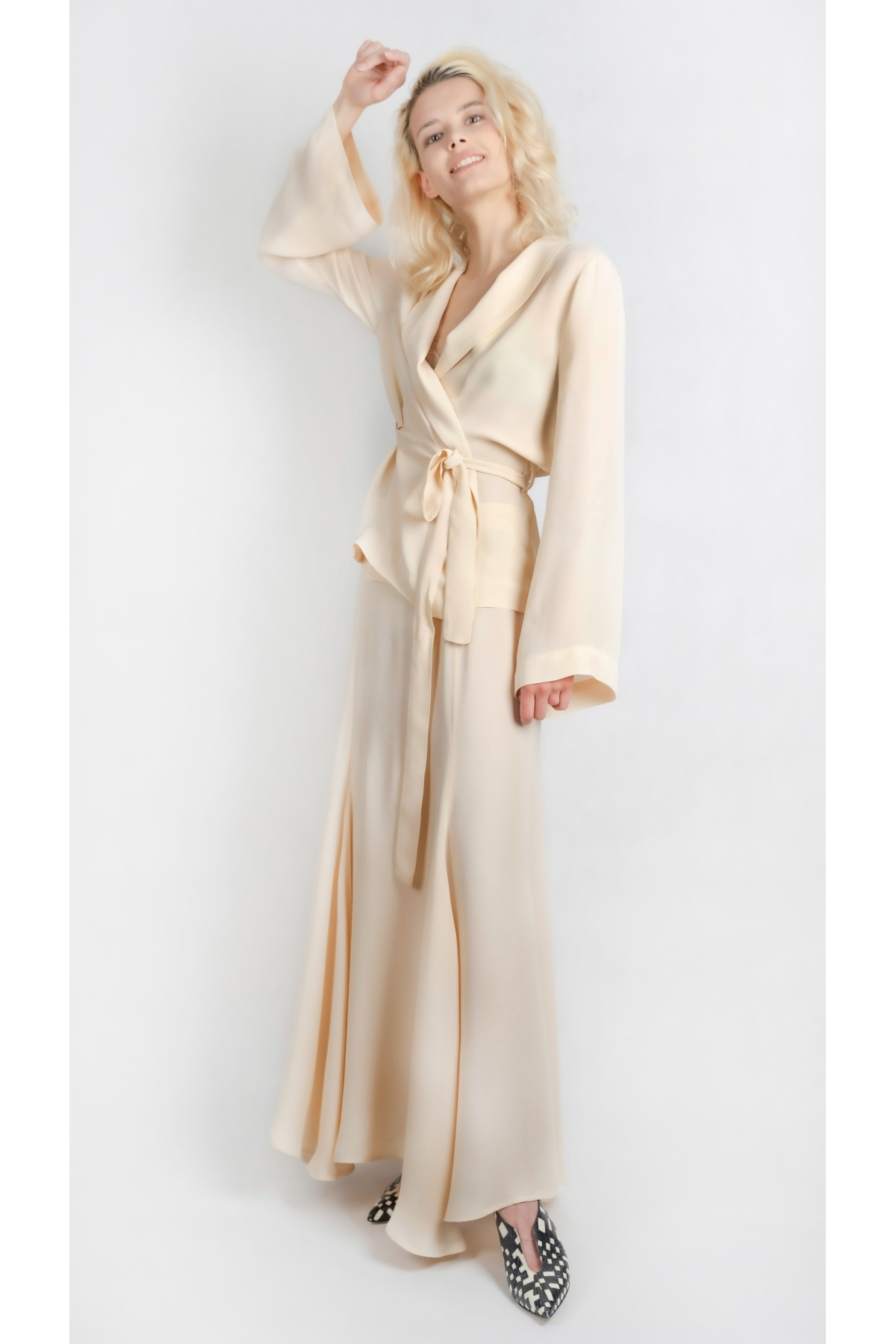 Viskose Anzug bestehend aus 2 Teilen, der Rock ist in einem interessanten Panel-Schnitt genäht, dadurch passt er sich schön an den Körper an. Die Kimonojacke ist vielseitig einsetzbar, ob ins Büro oder zu einem Cocktail Dinner. Jeder Anlass ist paasend.