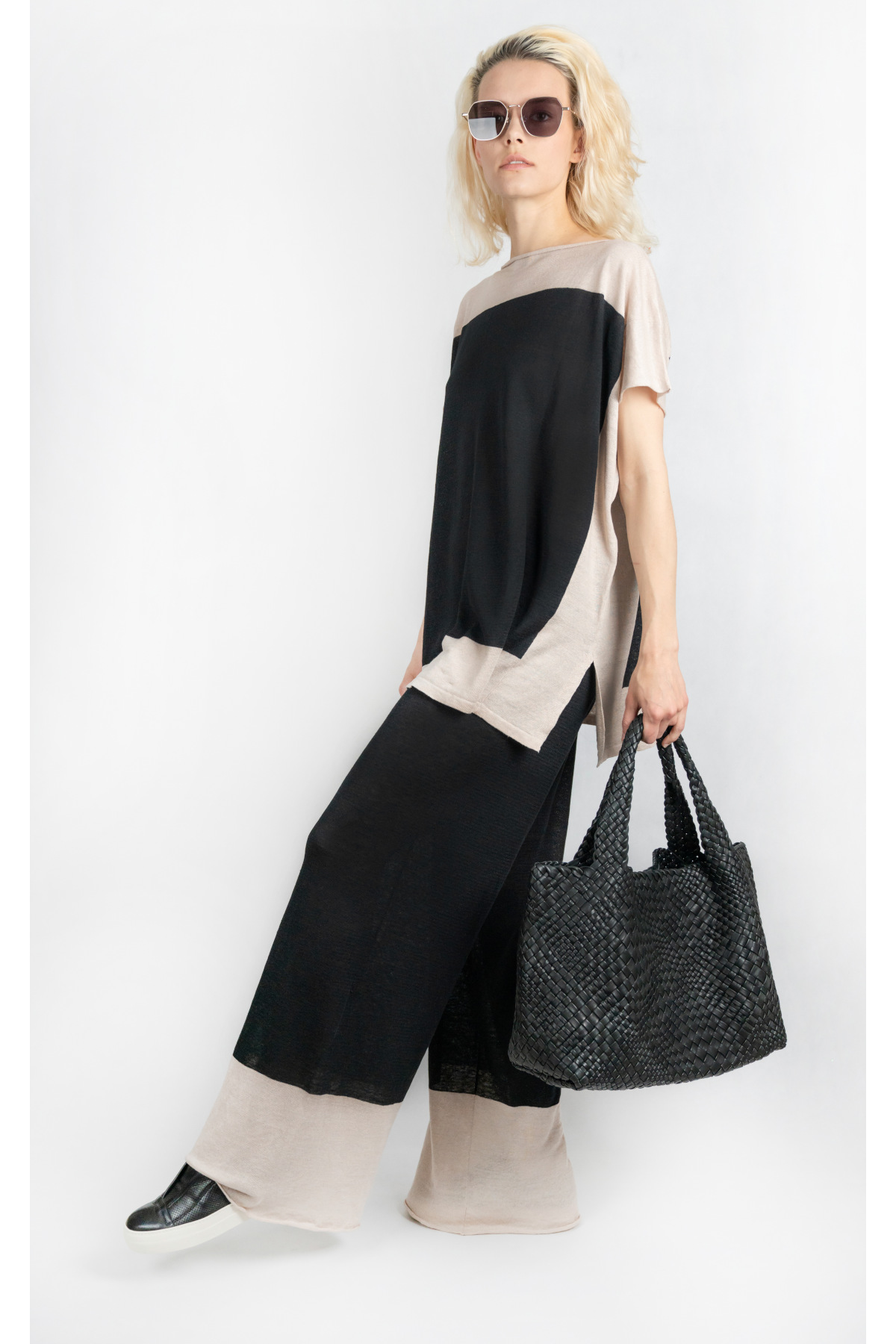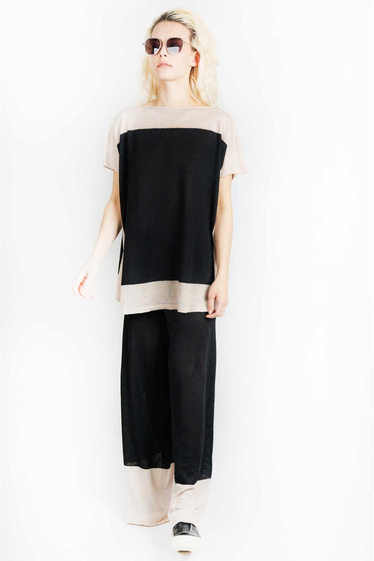 Eine elastische Mischung des lockeren Leinenanzug in sportlichem Look. Hochsitzende Hose mit weitem Bein und ein lockeres Schnitt des Oberteils.