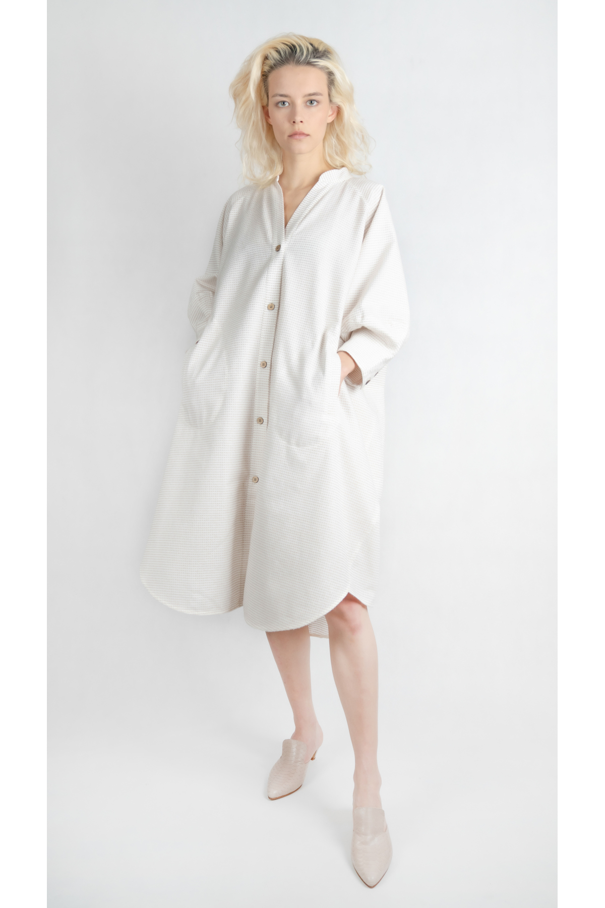 Oversized Baumwollkleid in einem Freizeitstill . Das Kleid ist mit dem Puffärmel und großen inneren Taschen versehen. Gerader Oversizedschnitt.