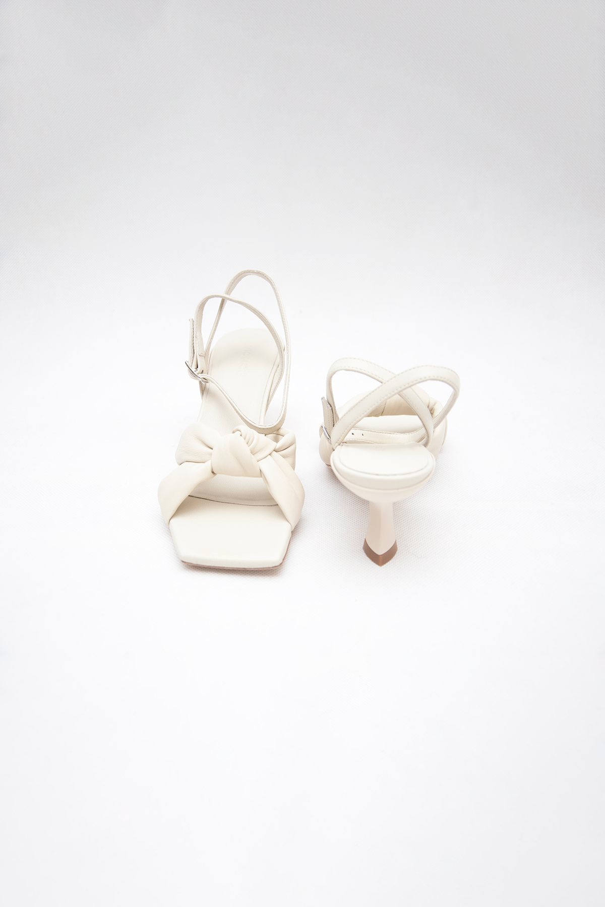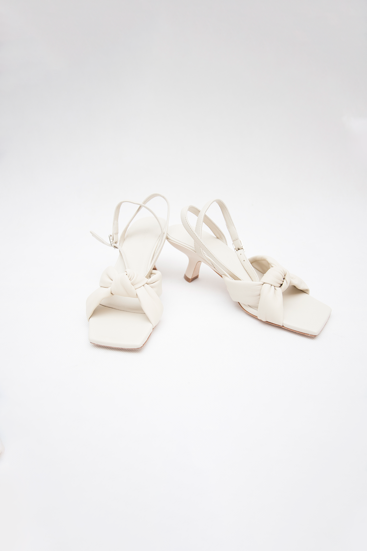 Sandalen aus weichen Kalbleder mit einem Knoten in Creme. Die Höhe des Absatzes beträgt 4,5 cm und die originelle Form des Schuhs lässt jedes Outfit aus der Menge stechen.