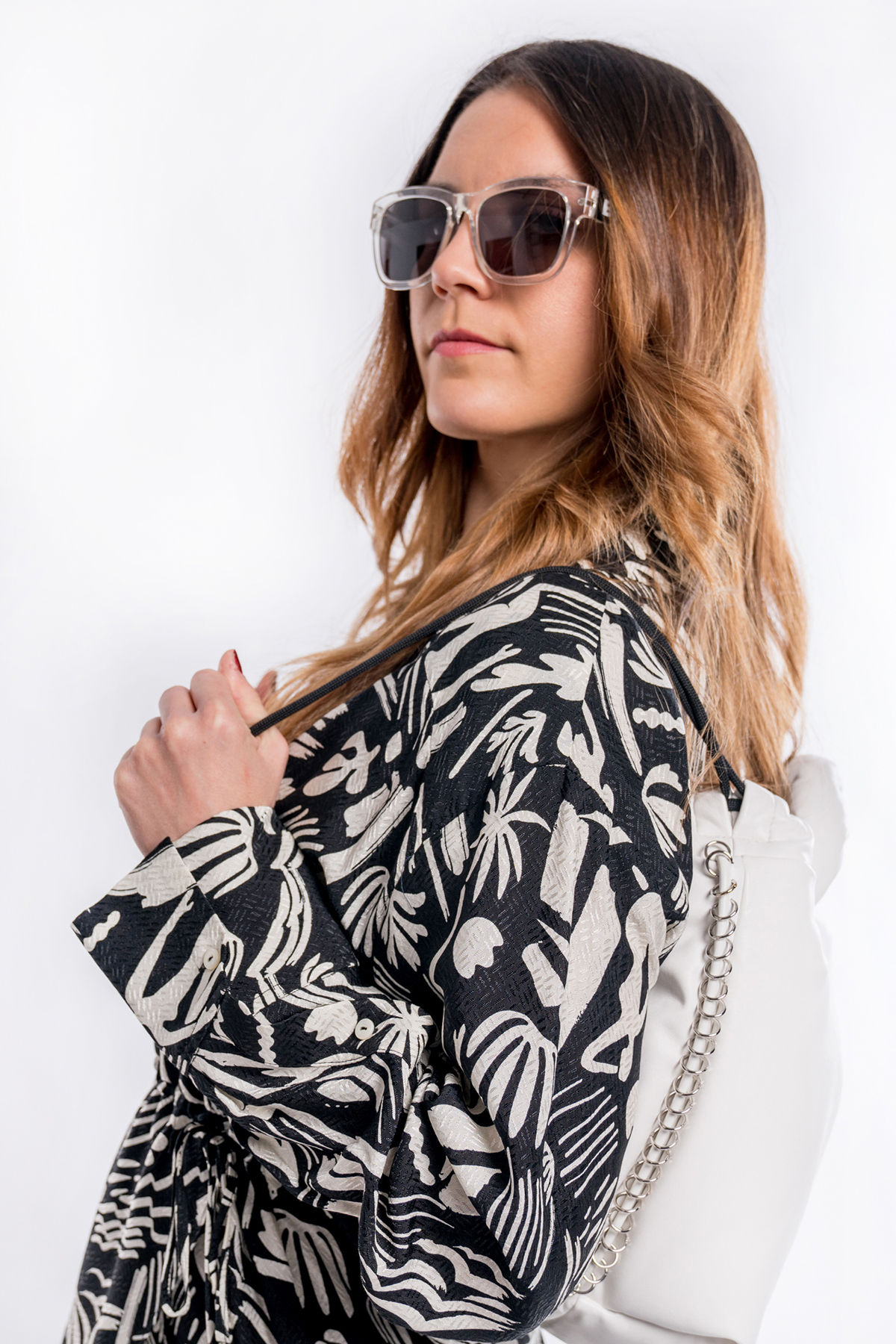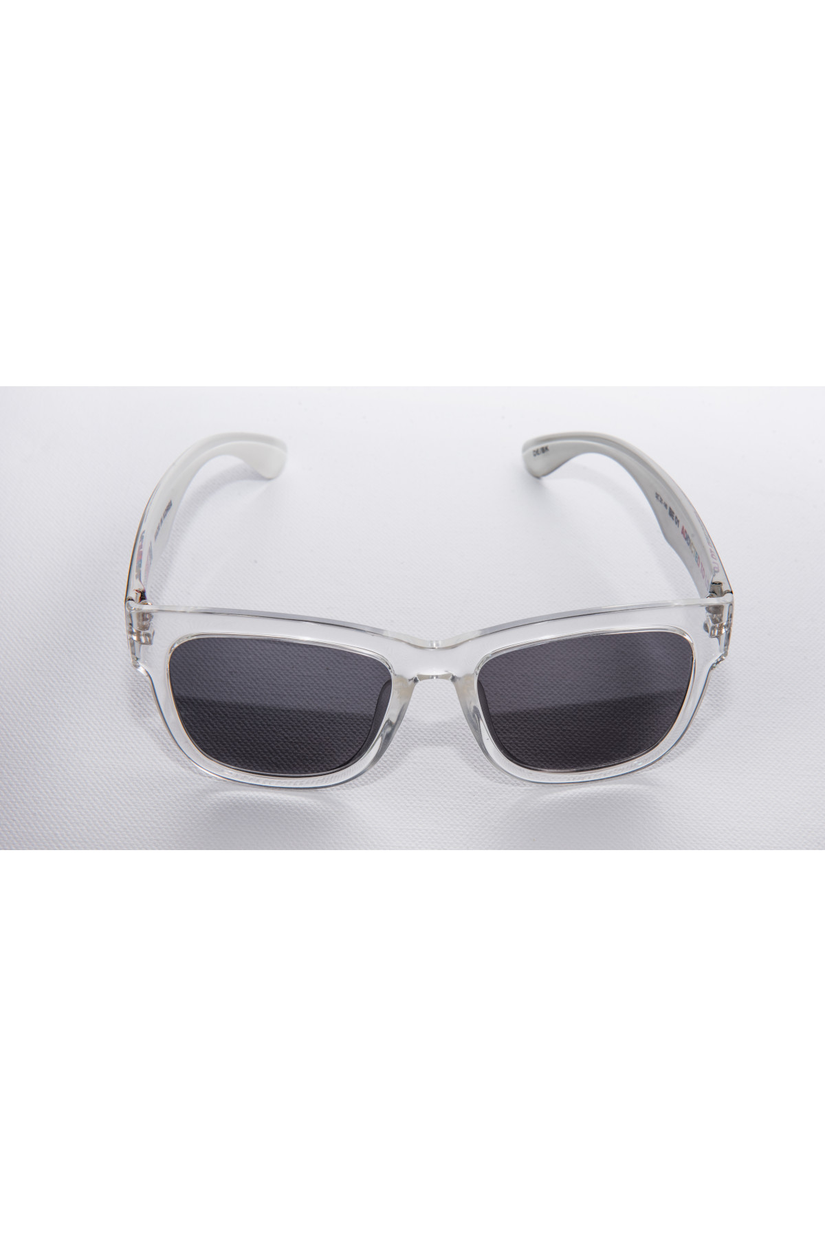 Die klassische, durchsichtige, eckige Sonnenbrille aus Kunststoff kann man jede Saison tragen. Das Modell wurde in Südkorea gefertigt und ist mit schwarzen Gläsern ausgestattet.