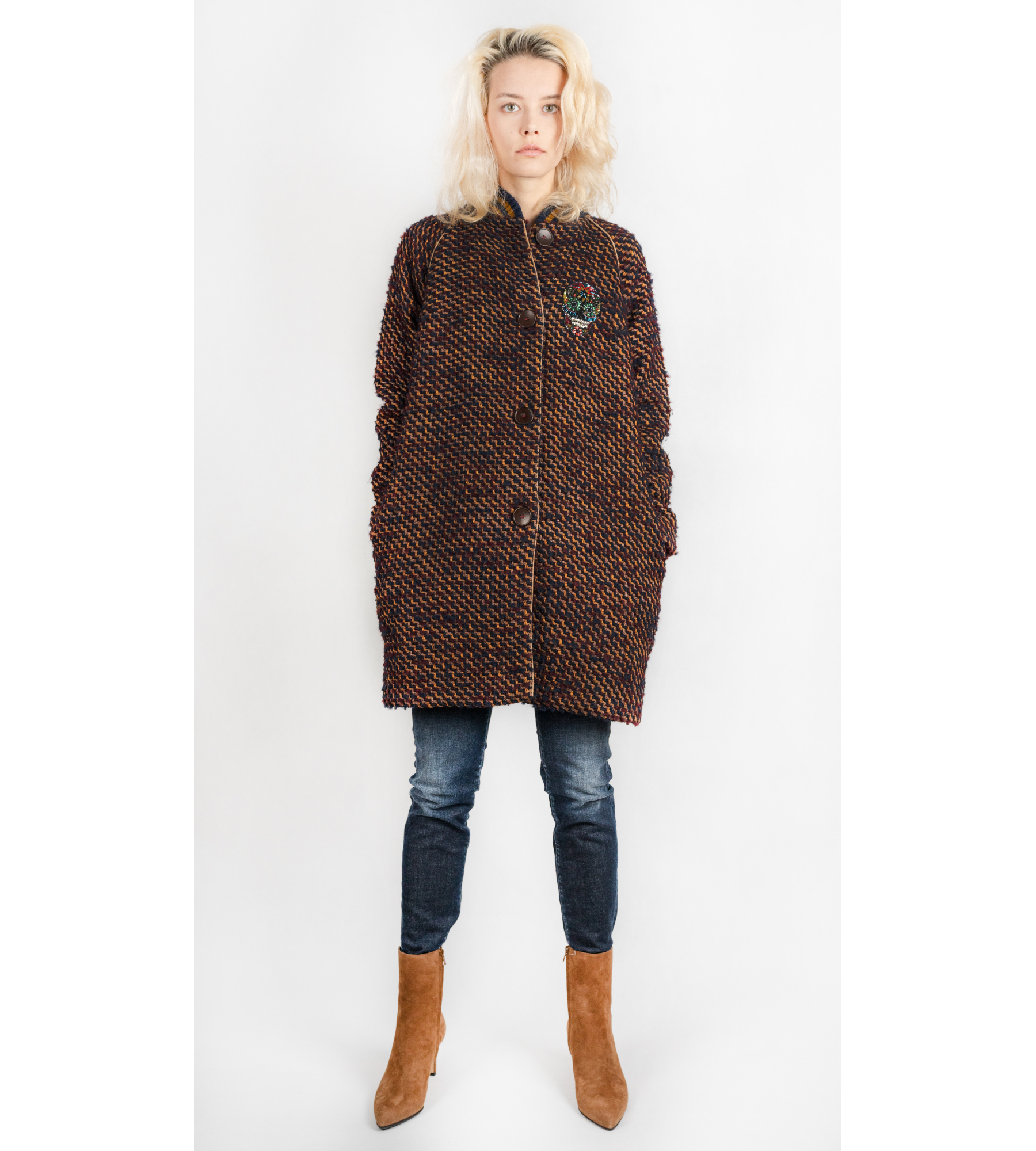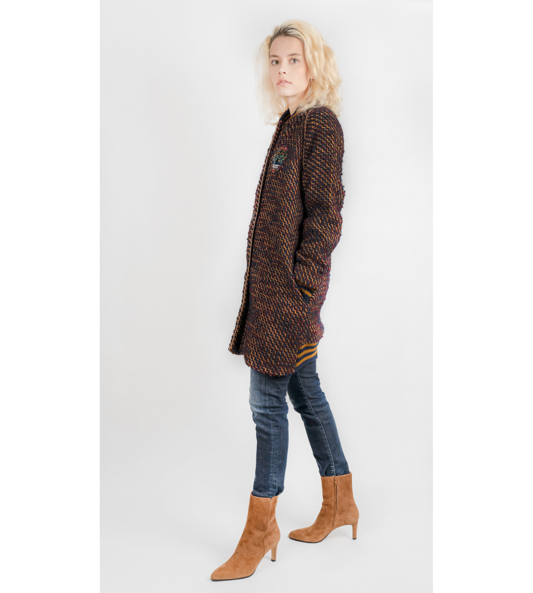 Eine Übergangsjacke in Boucle Optik aus einer Wollmischung mit einem Aufstick aus kristallen dekoriert.