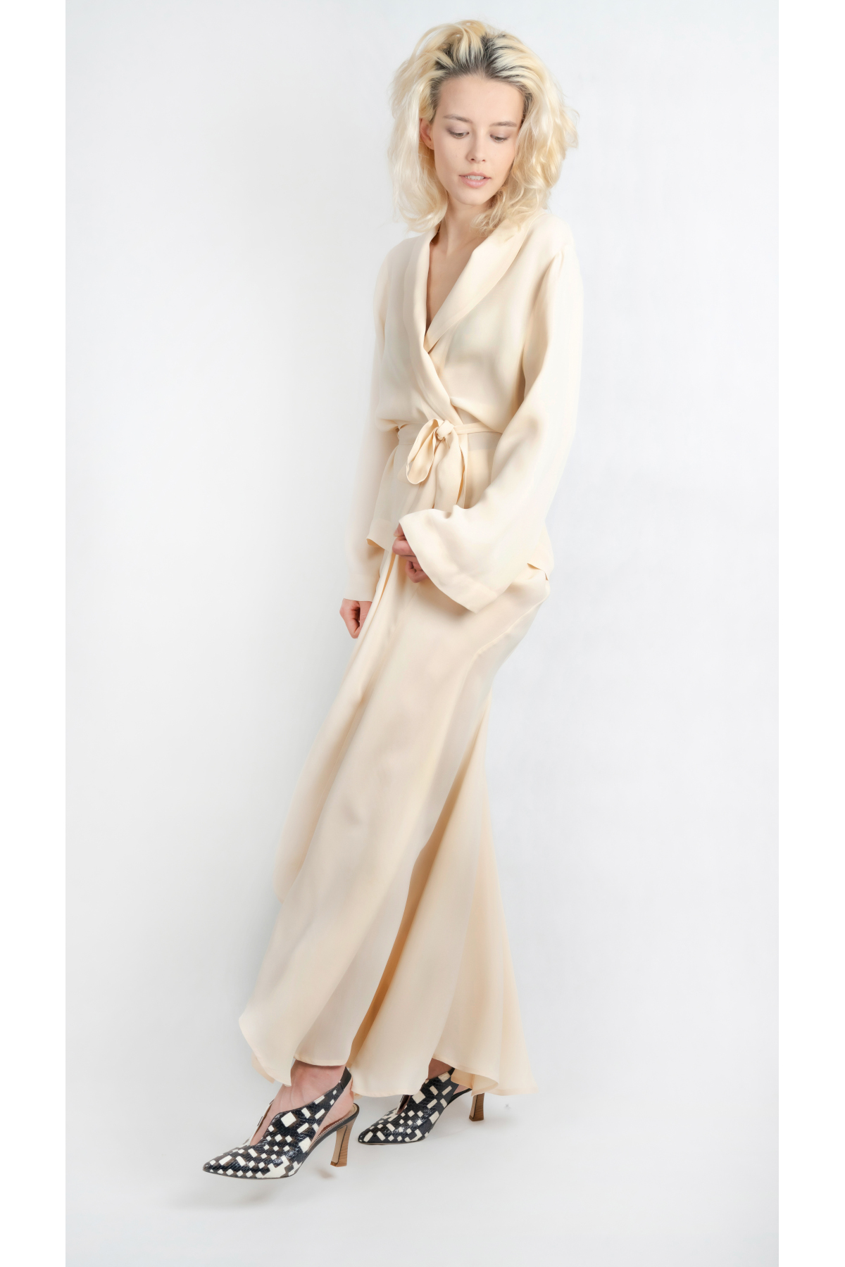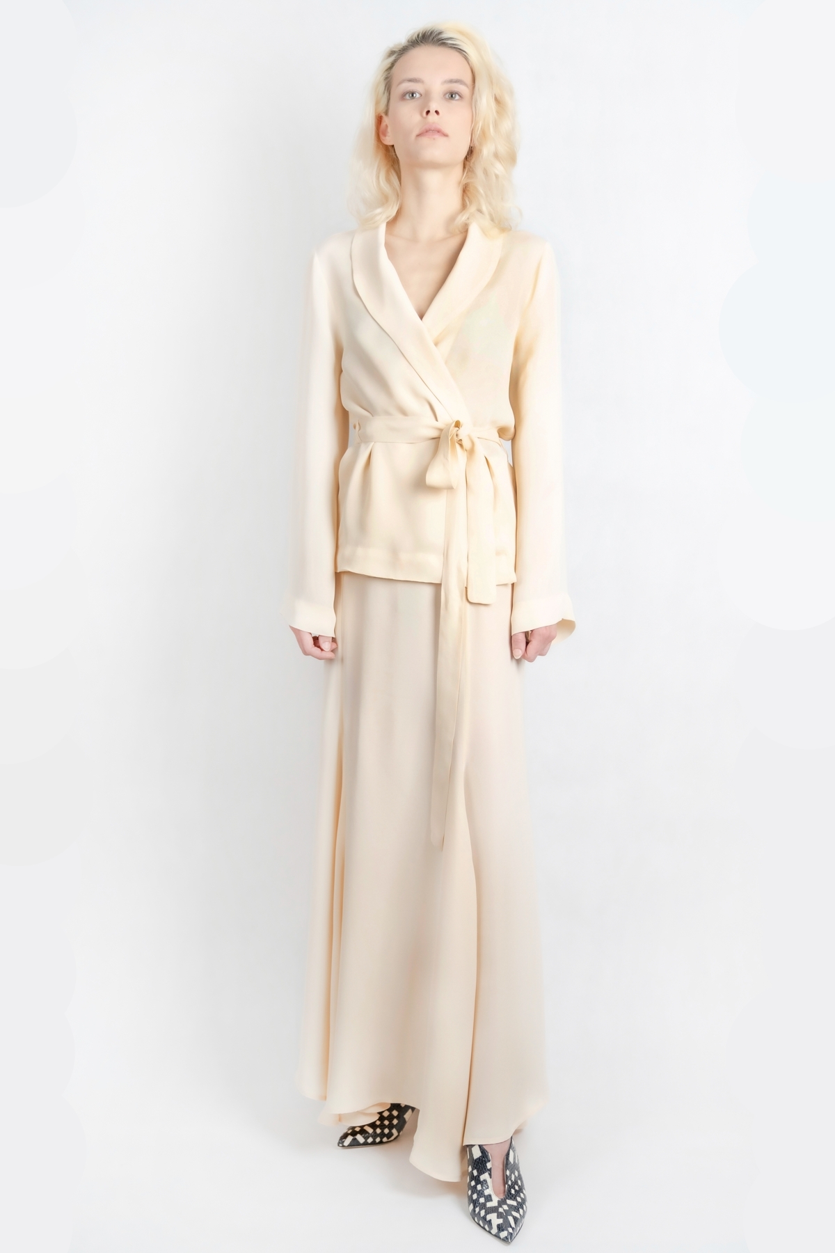 Viskose Anzug bestehend aus 2 Teilen, der Rock ist in einem interessanten Panel-Schnitt genäht, dadurch passt er sich schön an den Körper an. Die Kimonojacke ist vielseitig einsetzbar, ob ins Büro oder zu einem Cocktail Dinner. Jeder Anlass ist paasend.